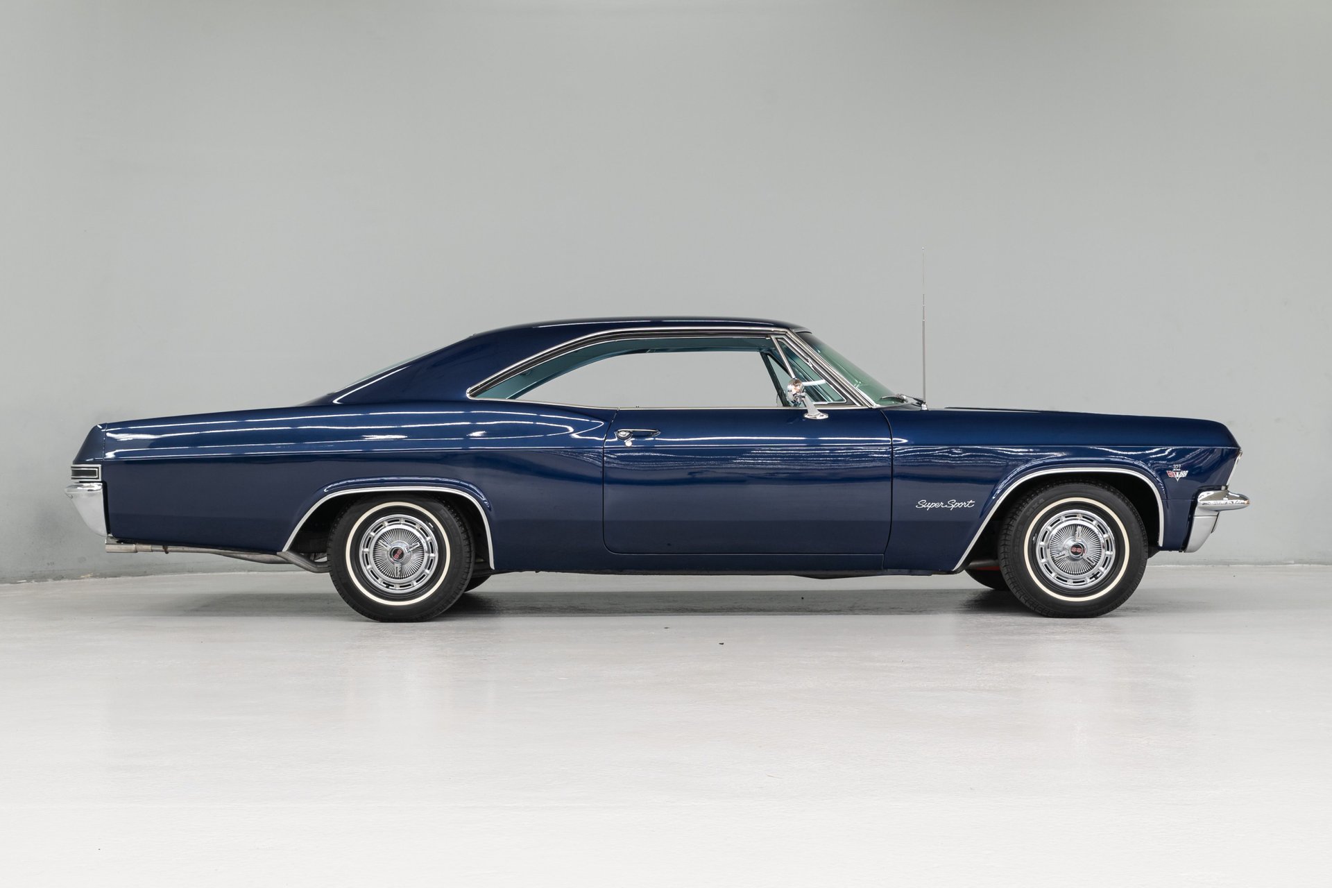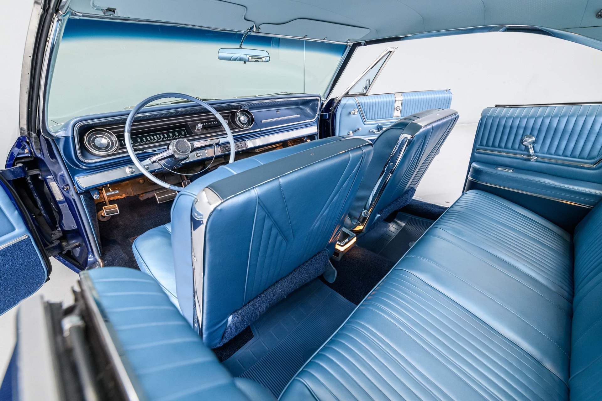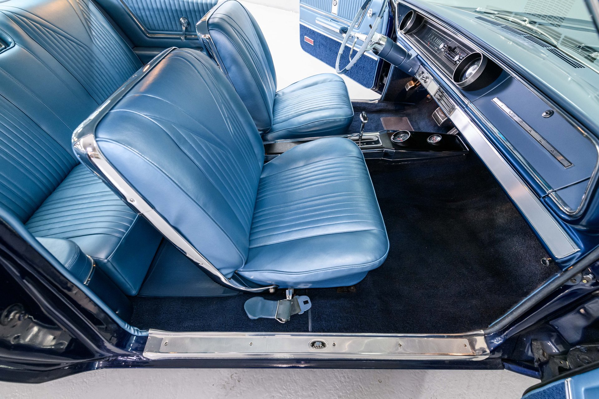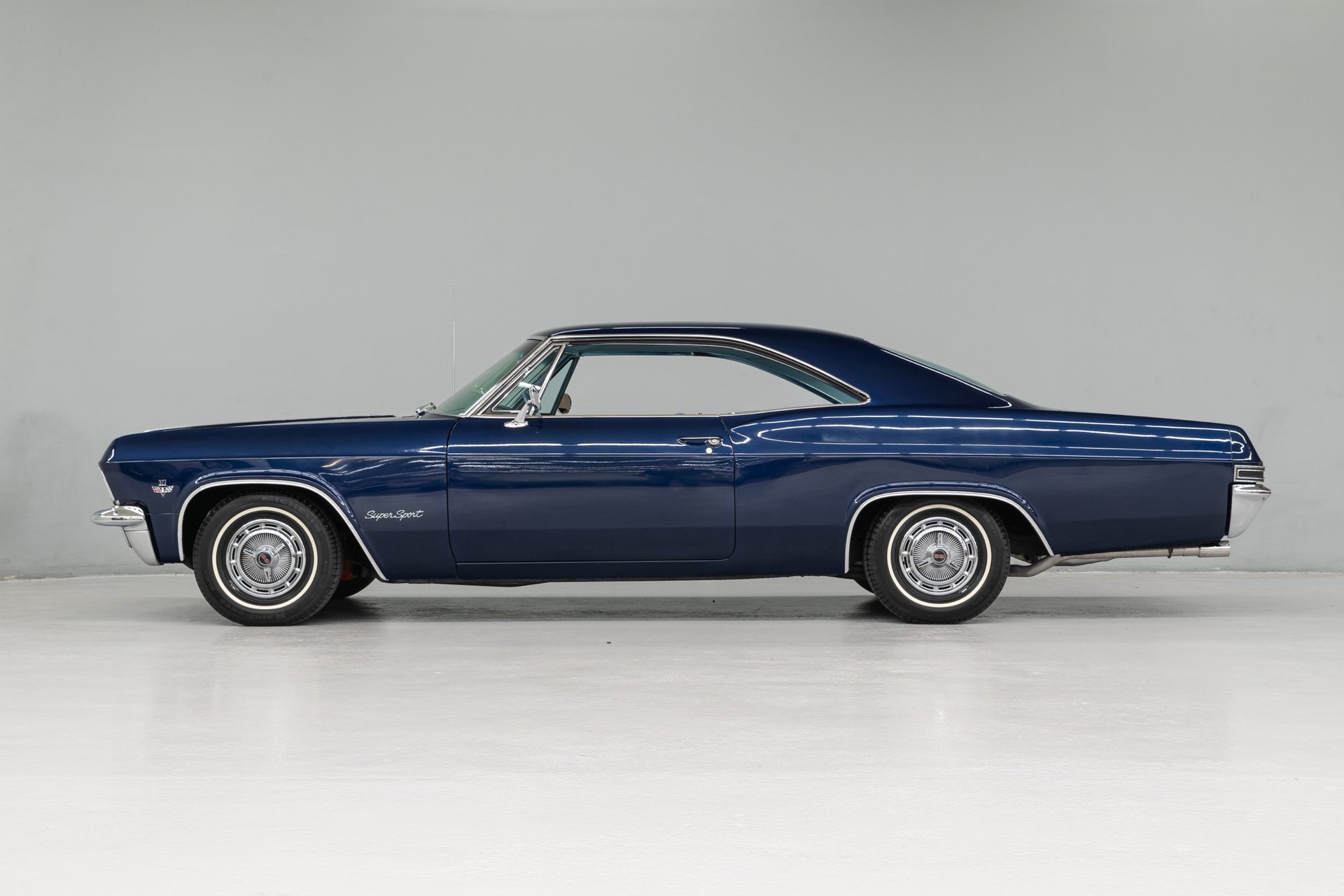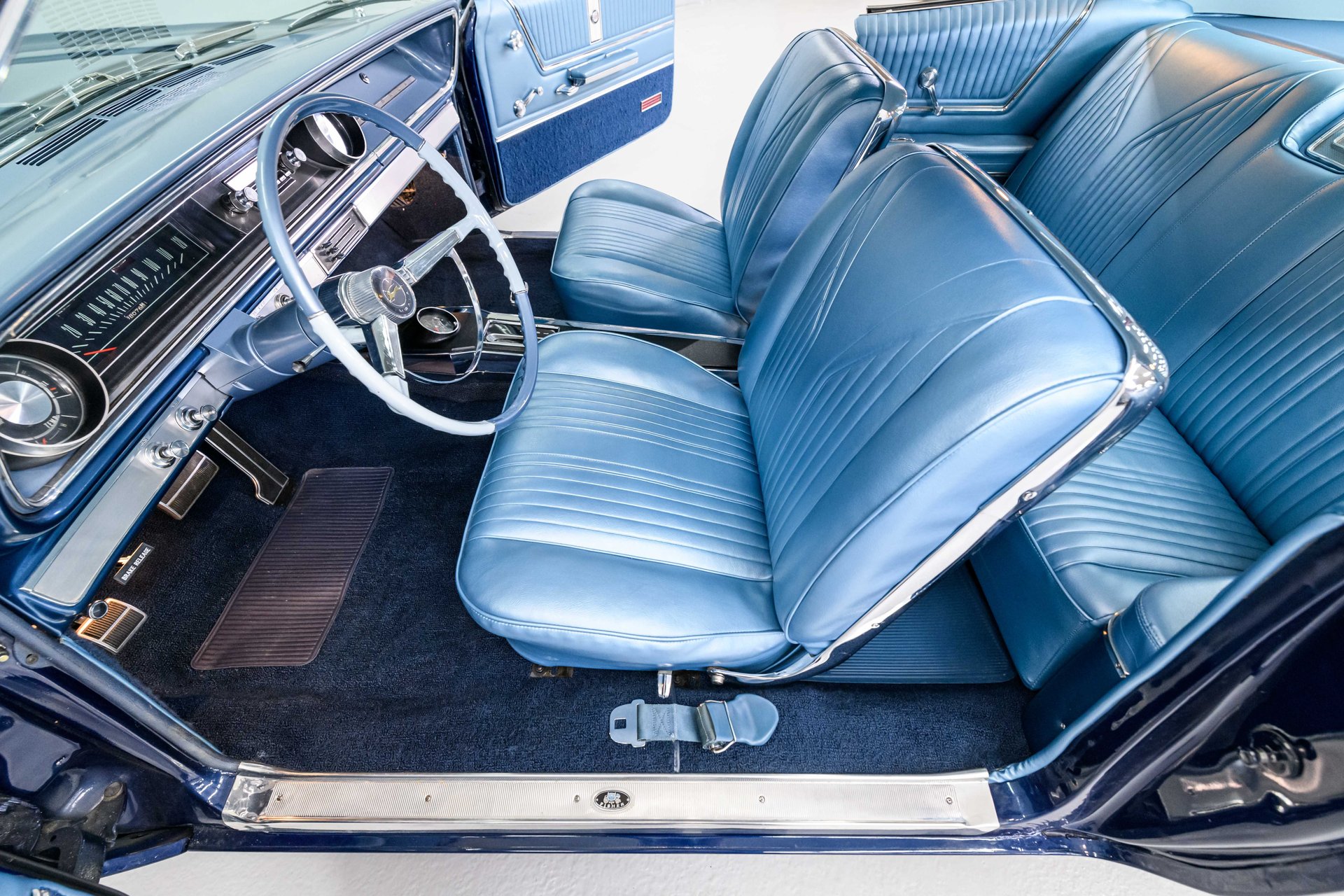 This fully restored 1965 Chevrolet Impala is a stunning classic, finished in Danube Blue with chrome SS spinner hubcaps and whitewall tires. The light blue vinyl interior features factory bucket seats, a center console, and a floor shifter. Powered by a strong 327 V8 with a 4-barrel carburetor, it delivers smooth performance through a PowerGlide 2-speed automatic. Equipped with power steering, 4-wheel drum brakes, and coil spring suspension, this Impala is a beautiful blend of style and comfort.