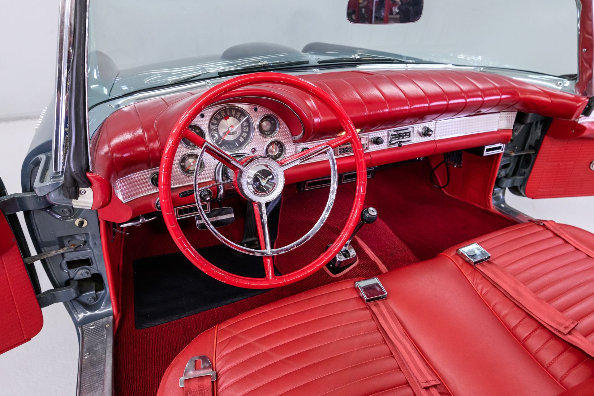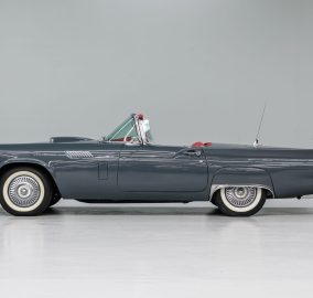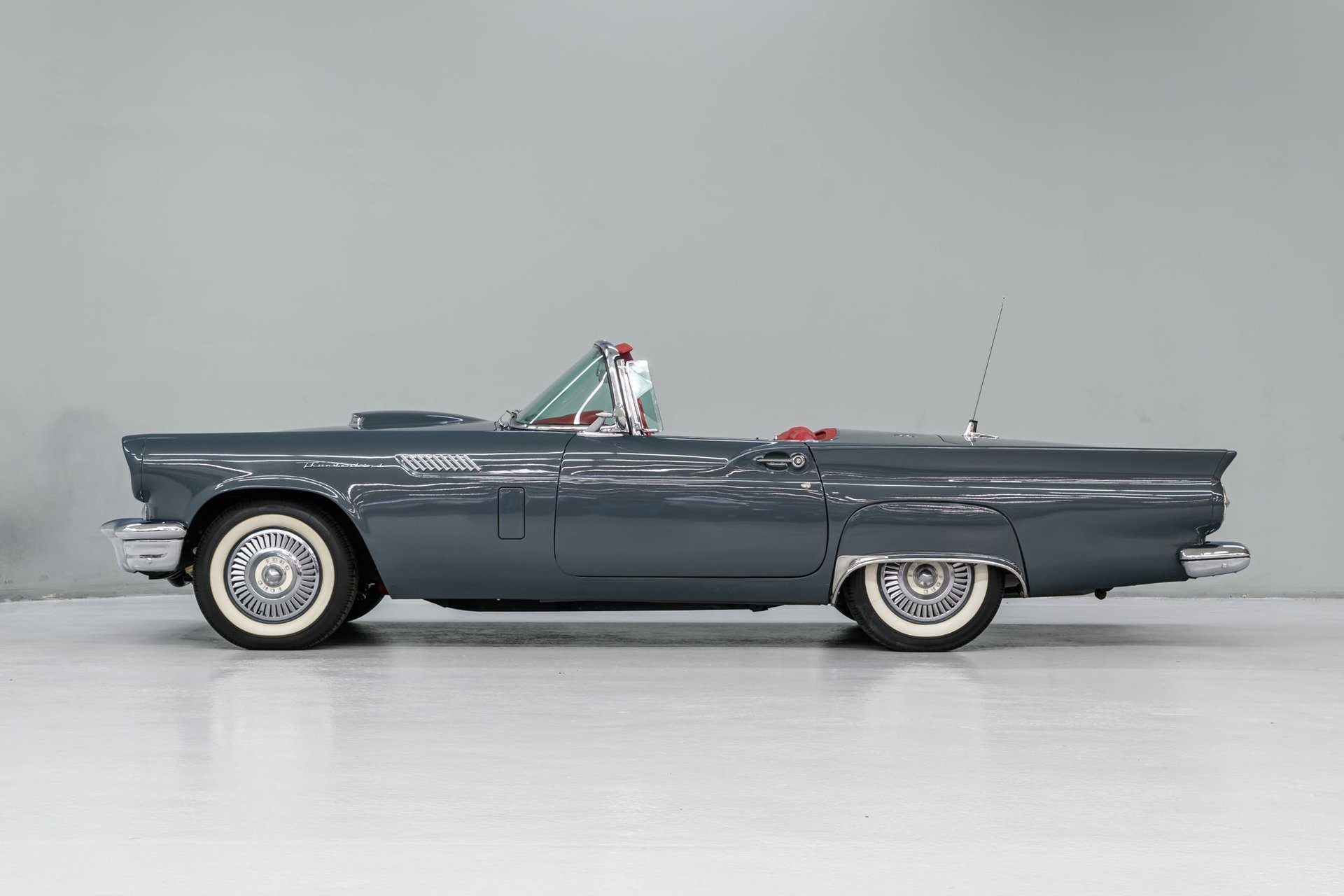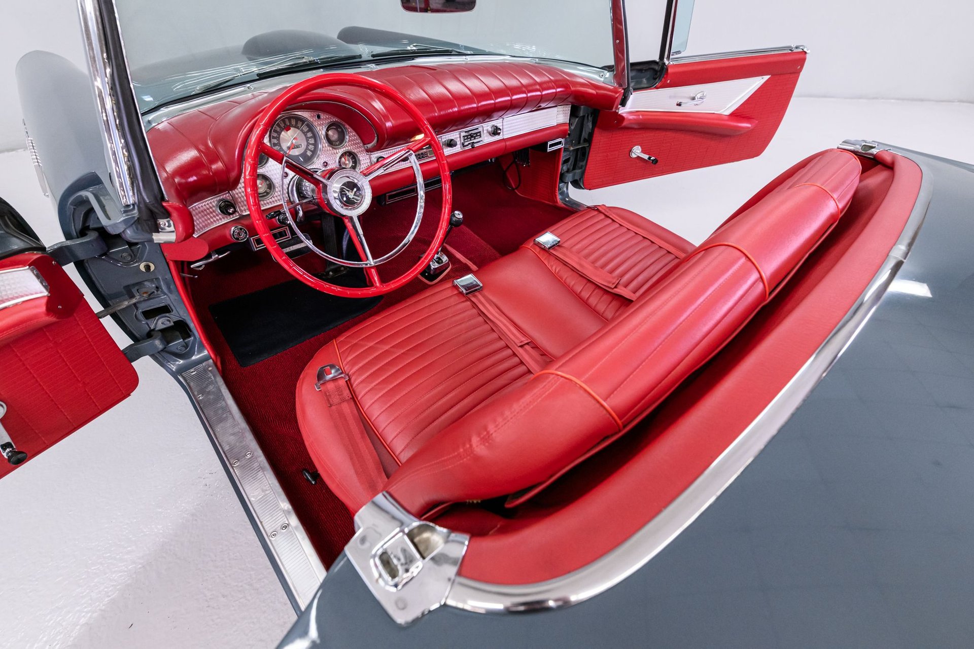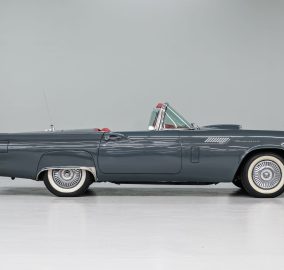 This 1957 Ford Thunderbird roadster has been fully restored to its original beauty. Finished in the original Gunmetal Gray with wide-white radial tires mounted on 14” steel wheels, this Thunderbird stands out. The manual convertible soft top is in great condition, with only a minor tear. The interior has been reupholstered in Flame Red vinyl, featuring the '57 restyled instrument cluster with round gauges. Under the hood, you'll find the rebuilt 312ci V8 engine, equipped with a 4-barrel carburetor and rated at 245hp. It also includes the 'Engine Dress-up Kit,' featuring a chrome air cleaner assembly