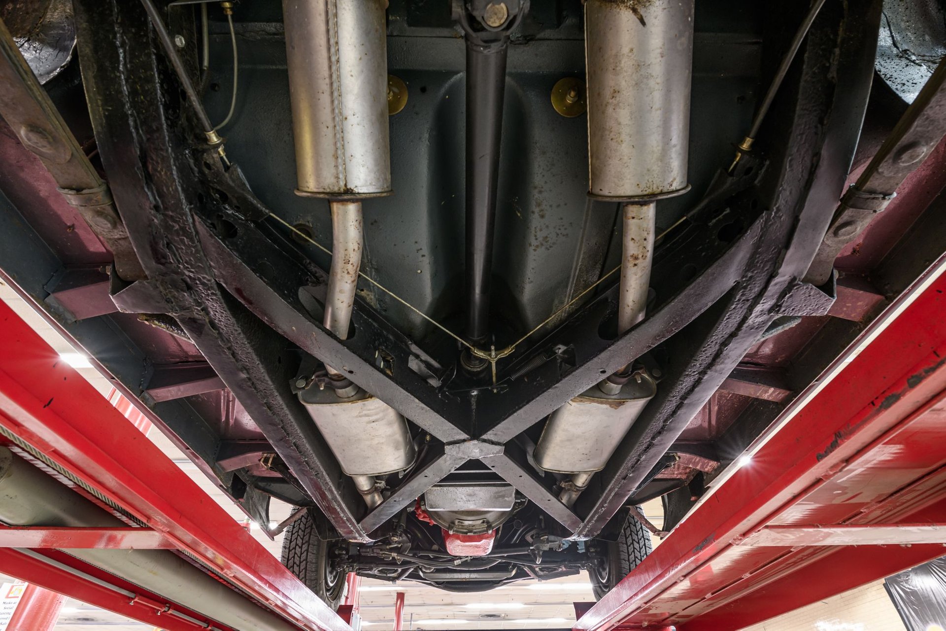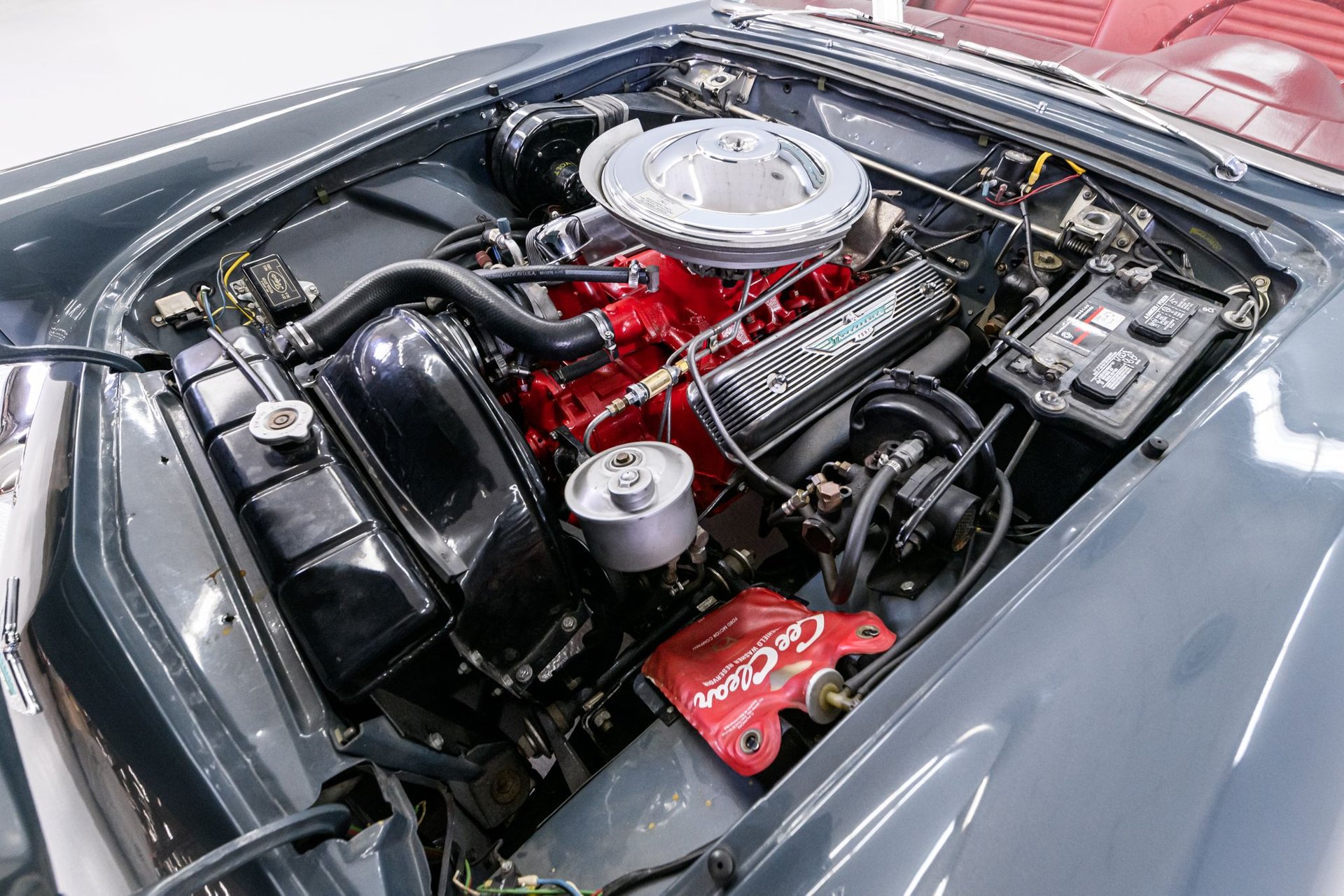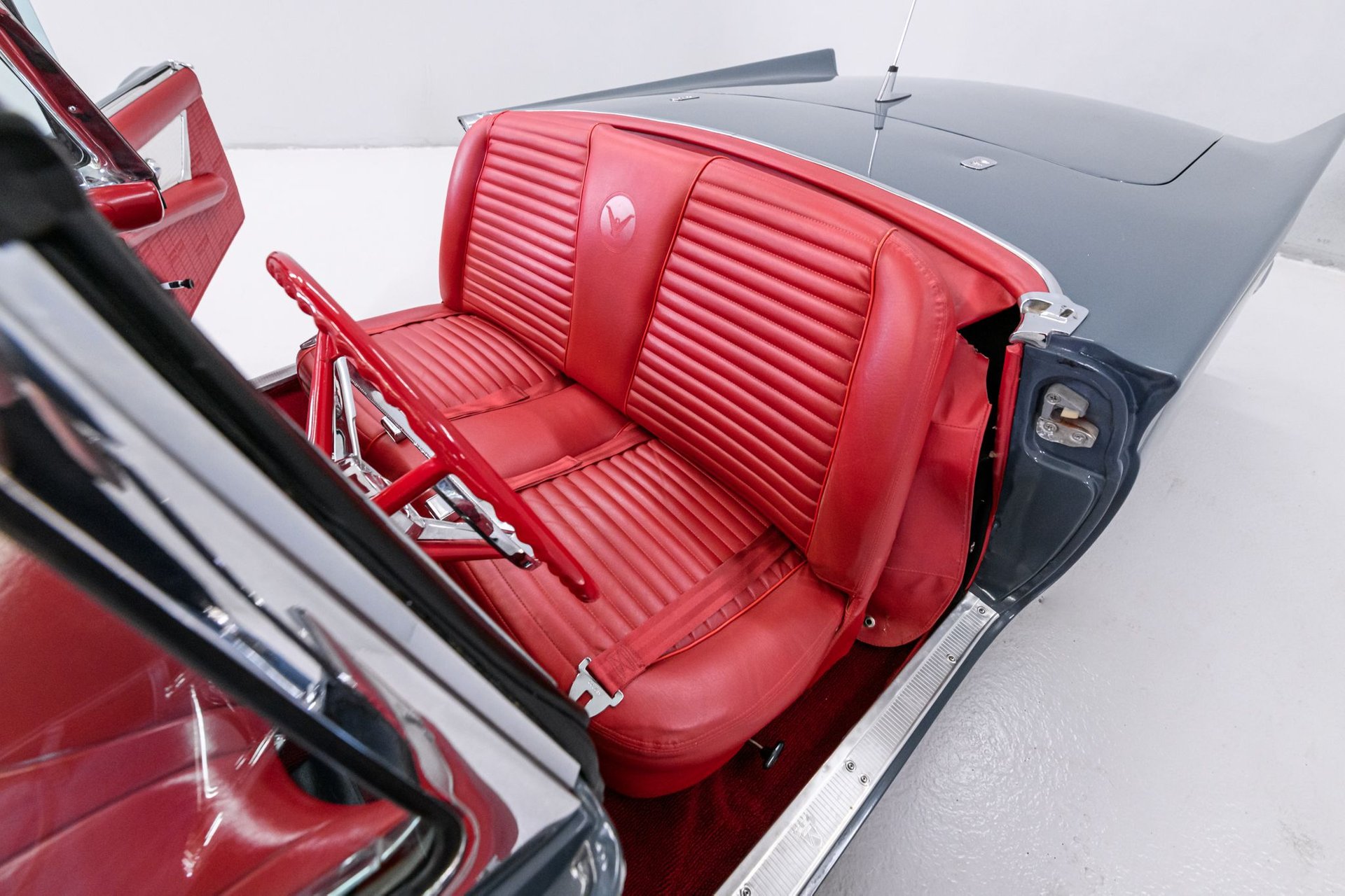 This 1957 Ford Thunderbird roadster has been fully restored to its original beauty. Finished in the original Gunmetal Gray with wide-white radial tires mounted on 14” steel wheels, this Thunderbird stands out. The manual convertible soft top is in great condition, with only a minor tear. The interior has been reupholstered in Flame Red vinyl, featuring the '57 restyled instrument cluster with round gauges. Under the hood, you'll find the rebuilt 312ci V8 engine, equipped with a 4-barrel carburetor and rated at 245hp. It also includes the 'Engine Dress-up Kit,' featuring a chrome air cleaner assembly